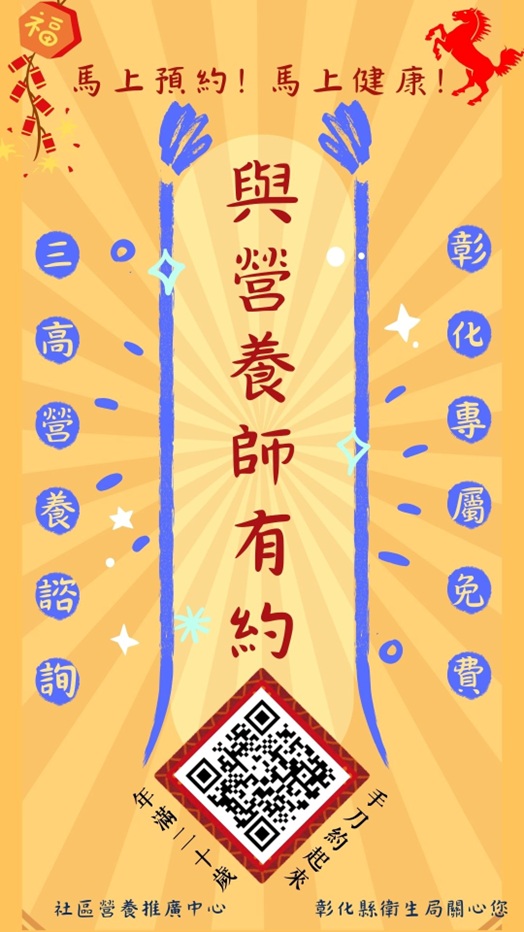 ::: 首頁 › 訊息專區 › 最新消息 最新消息 【與營養師有約】 2026-03-18 彰化縣衛生局免費營養諮詢 服務對象:年滿20歲,且有高血壓、高血糖或高血脂者適用 掃描QR Code線上報名 全縣27家衛生所皆可諮詢 立即預約https://consulting.chshb.gov.tw/RsuApp/RsuAppQ000 #免費營養諮詢 #彰化縣衛生局 #三高防治 回列表