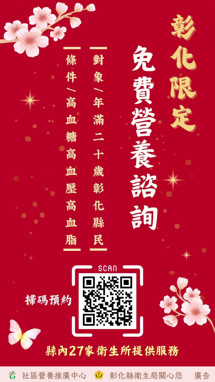 ::: 首頁 › 訊息專區 › 最新消息 最新消息 【彰化縣限定-免費營養諮詢】 2026-02-06 服務對象:年滿20歲,且有高血壓、高血糖或高血脂者適用 掃描QR Code線上報名 全縣27家衛生所皆可諮詢 立即預約https://consulting.chshb.gov.tw/RsuApp/RsuAppQ000 #免費營養諮詢 #彰化縣衛生局 #三高防治 回列表