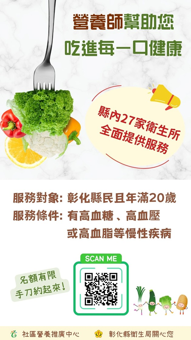 ::: 首頁 › 訊息專區 › 最新消息 最新消息 營養師幫助您 吃進每一口健康 2026-04-20 彰化縣27家衛生所提供服務 年滿20歲、三高族群皆可諮詢 免費營養諮詢 名額有限 快掃碼預約,把健康帶回家! 立即預約https://consulting.chshb.gov.tw/RsuApp/RsuAppQ000 #彰化衛生局 #營養諮詢 #健康飲食 回列表